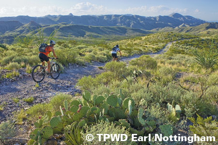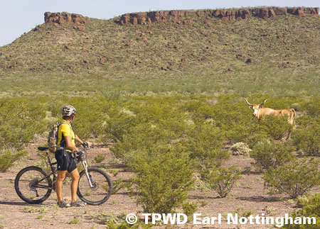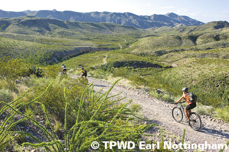 As I careened into the vast wilderness on my pink dual-suspension bike rented from the Bicycle Sport Shop in Austin, I was grateful to have as my guides Dan Sholly, an avid biker and the deputy director of the Texas Parks and Wildlife Department’s state parks division, and David Riskind, the state parks division’s natural resources director, who would be sharing his knowledge of the park and driving a support-and-gear (SAG) vehicle to meet us for lunch each day. Although physically fit, I was new to the sport of mountain biking. I knew that the desert could become dangerously hot in May and that water sources were unreliable, making SAG support more necessity than luxury. Dan advised me early on: “Start slow, and then taper off.”